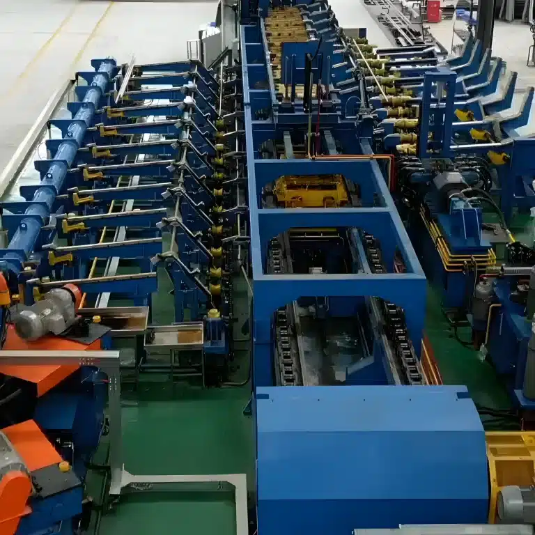 1、钢管定尺多头下切锯生产线是一条高度自动化的生产线,专为钢管的精准切割和加工设计,覆盖了从上料到质量检测的完整流程。这条生产线通过精密的控制和自动化设备,确保