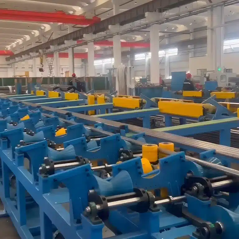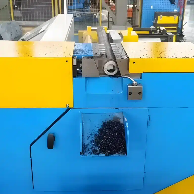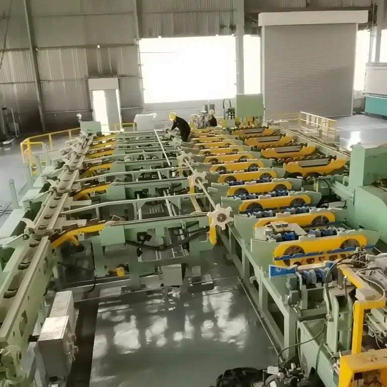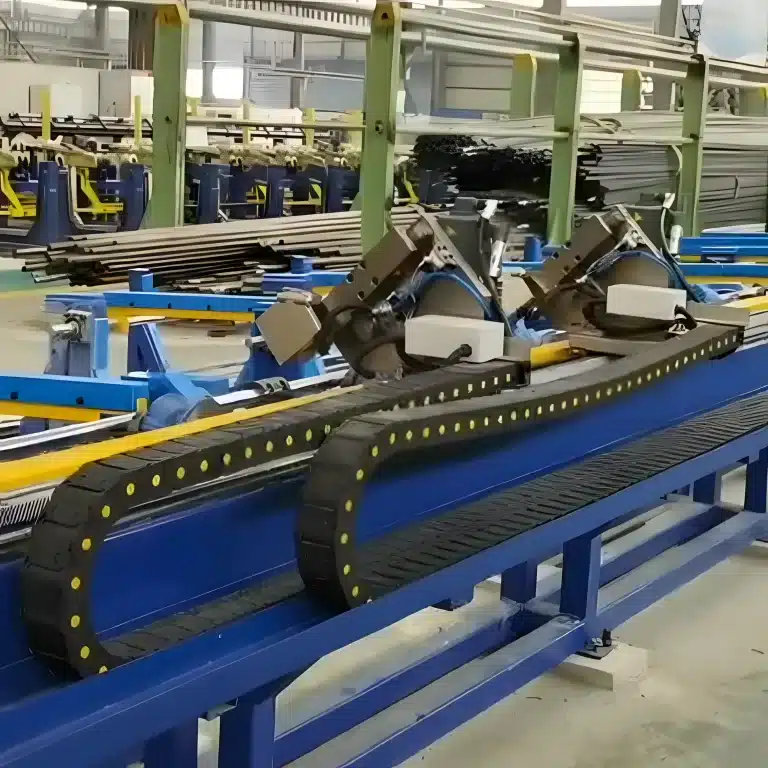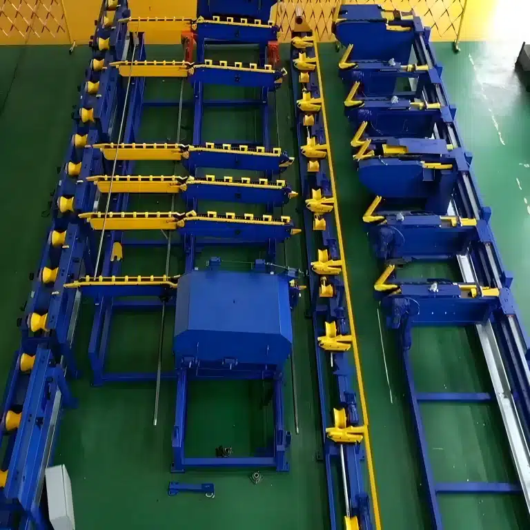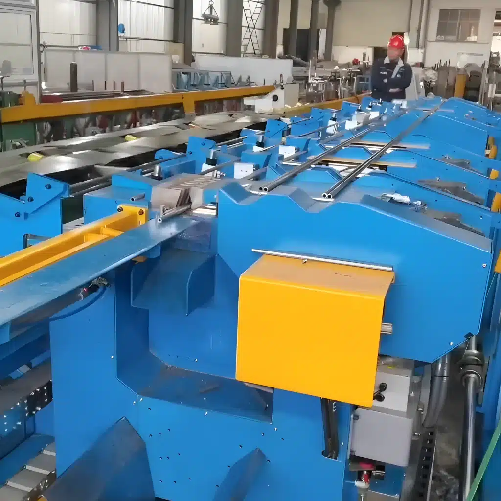 1、钢管定尺多头下切锯生产线是一条高度自动化的生产线,专为钢管的精准切割和加工设计,覆盖了从上料到质量检测的完整流程。这条生产线通过精密的控制和自动化设备,确保